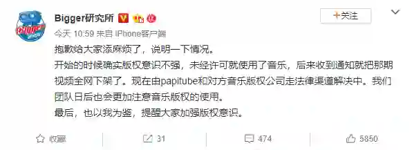 7月24日上午,papitube旗下视频博主@Bigger研究所 发文说明情况,“开始的时候确实版权意识不强,未经许可就使用了音乐,后来收到通知就把那期视频全网下架了。现在由papitube和对方音乐版权公司走法律渠道解决中”。