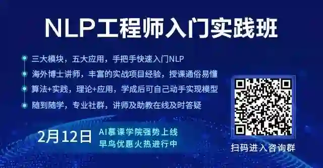 三大模块,五大应用,手把手快速入门NLP、海外博士讲师,丰富项目经验、算法+实践,搭配典型行业应用、随到随学,专业社群,讲师在线答疑,详情点戳阅读原文链接或长按识别下方二维码~