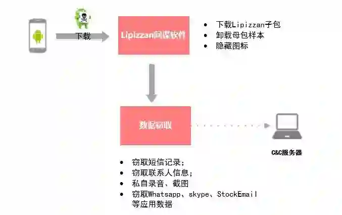 第二阶段:Lipizzan“间谍软件”在安装运行后,能对被感染的设备进行检测,当设备环境符合一定标准后获取设备的root权限,对用户的短信记录、联系人名录、电子邮件甚至是一些知名APP的隐私数据等进行收集,并在用户毫无感知的情况下上传至攻击者服务器。