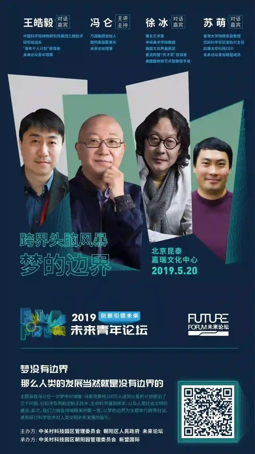 万通集团创始人、御风集团董事长、未来论坛理事 冯仑 更带着他的“梦的边界“来到现场与著名艺术家、中央美院教授、美国文化界最高奖麦克阿瑟“天才奖“获得者、美国国务院艺术勋章授予者 徐冰,中国科学院动物研究所基因工程技术研究组组长、“青年千人计划“获得者、未来论坛青年理事 王皓毅,香港大学物理系副教授、空间科学实验室执行主任、起源太空科技CEO、未来论坛青创联盟成员 苏萌,展开跨界头脑风暴,更有多项青年创新达人秀参与交流和碰撞。