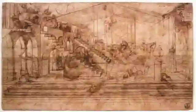 为美第奇家族的庆典表演服务是达·芬奇学徒时期的重要工作之一。达·芬奇乐在其中,他研究了如何让不同位置的观众都能看出透视效果,还热衷于将幻觉与现实融合在一起,十分富有想象力。设计特效、服装、布景和舞台机械也让他乐此不疲。