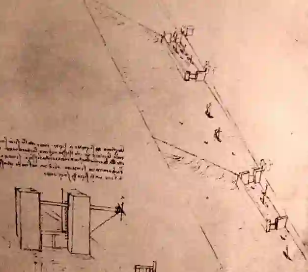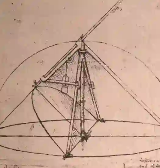 在达·芬奇的笔记中能看到不少飞行装置,其中最著名的是飞机螺旋桨草图,经常被称为直升机设计的鼻祖。理论上,这个由亚麻布、绳索和支架构成的螺旋装置可以通过旋转升空,比莱特兄弟早了将近500年!当时,佛罗伦萨人的演出中经常有人物或道具从天而降,或者如魔术般的悬在半空。类似的笔记页中还有一些跟演出相关的内容,因此,这些飞行装置当时有可能是为了娱乐观众而设计的。