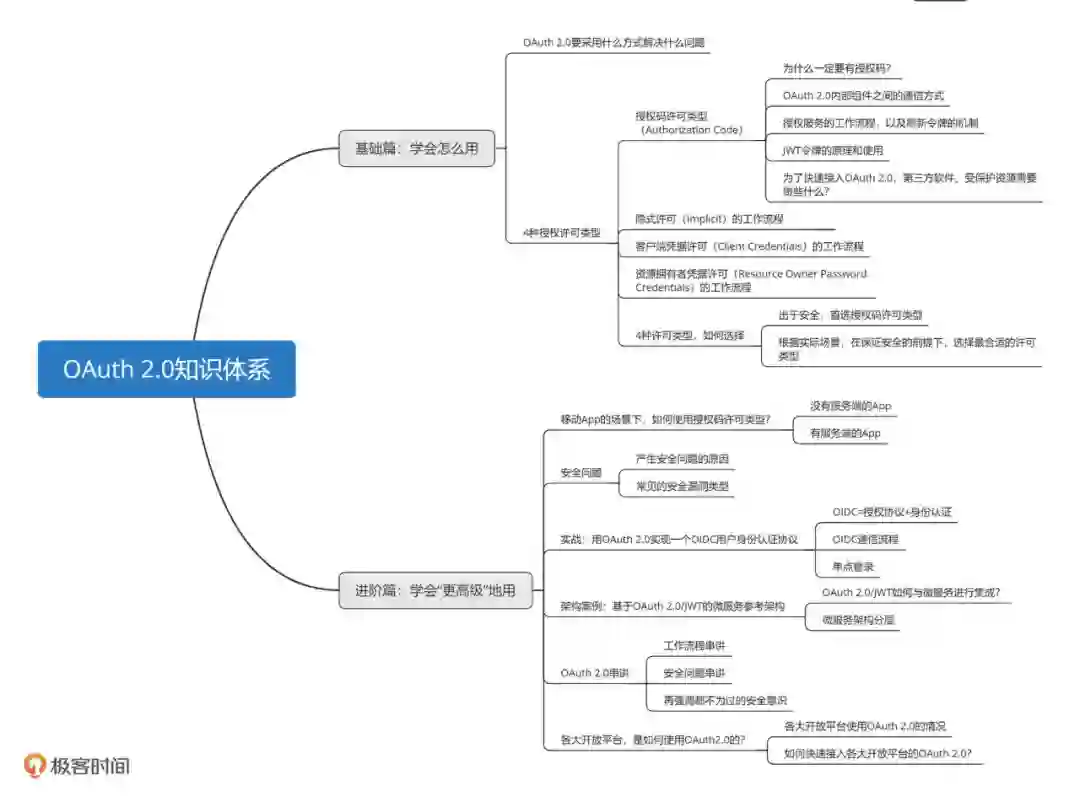 为此,我为你总结了一张 OAuth 2.0 知识结构图,只有对每个知识点仔细梳理并深入理解,才能解决工作中的实际问题。