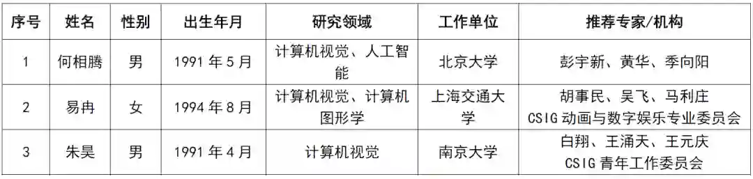 中国图象图形学学会推荐第八届中国科协青年人才托举工程项目拟推荐人选名单