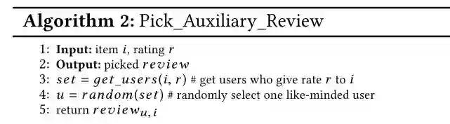 第一步选出跟对一商品,与当前用户u打同样分数的其他user,第二步随机选择一个user,将该user评论当前item的review加入到当前user的review 集合,作为补充信息。