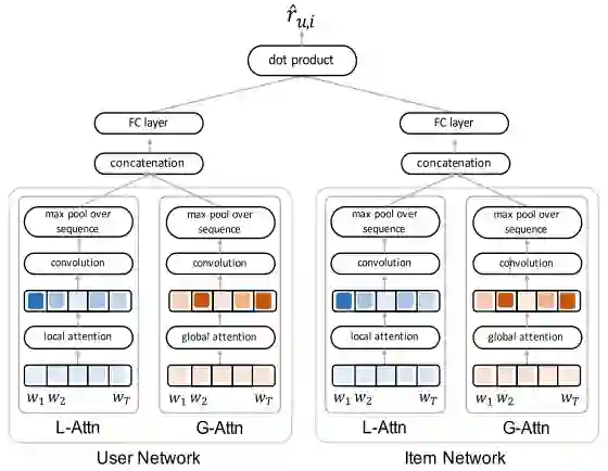这篇文章在DeepCoNN的基础上引入了词级别的attention,不同的词对于建模用户和商品的重要性是不同的, 因此这篇文章引入了两种词级别的注意力机制:local and global attention 都是为了寻找更informative的词,为不同的词赋予不同的权重。