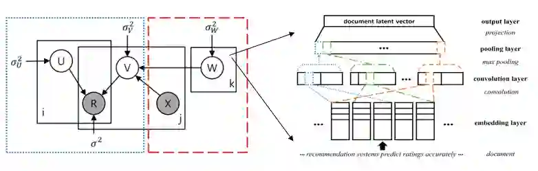 现在看来这篇文章的思路其实很简单,利用CNN提取商品的feature,之后将其融入到PMF中。其实这种方法也是深度学习与概率图模型的结合的一种很直接的方式,用深度模型学到的特征替换某一分布的参数,可以理解为先验。后来也有不少工作在这个思路上发展,比如偶然看见的WWW2018的一篇Poster:
