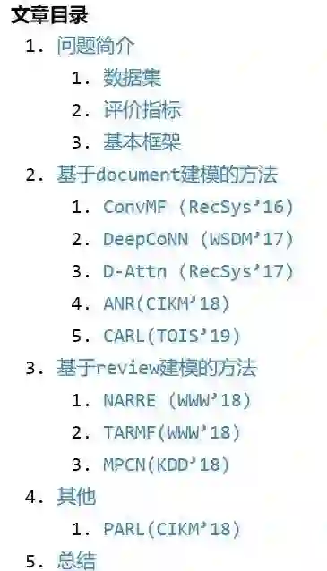 基于评论文本的推荐系统其实一定程度上跟NLP技术的结合更多,不过场景和动机都是出自推荐领域,本身在实际应用中远少于一些CTR系列的推荐工作,属于一个小领域。上面的几篇文章算是这个领域的有代表的,当然有很多其他优秀的文章由于时间,精力等原因并没有介绍进来,可能后续会继续补充。从近几年的趋势来看, 大家基本都已经明了这块的工作基本上从框架中的三个部分着手进行改进:编码层,融合层和评分预测层。对于review来说,显然核心是编码层,毕竟融合层和评分预测层毕竟在其他推荐领域也都是共同问题。虽然自己没有多少文章,还是很小白,不过我们也准备投一篇相关Survey去试试水~