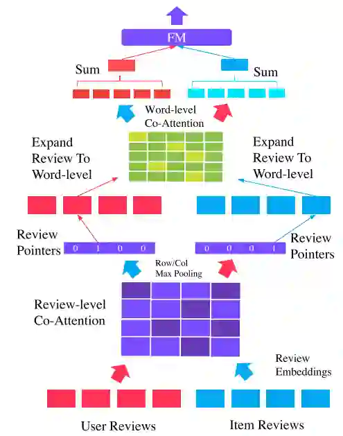 首先对每一条评论建模,利用word embedding 得到评论矩阵,本文没有使用CNN/RNN直接将评论里面所有词的embedding求和作为当前review的特征。前面说这篇文章的核心就是在找出在当前user-item 对的情况下,哪些评论重要与否。因此文章首先对评论做一个预处理,利用一个类似RNN的那种门控机制,预期能够控制一些重要信息进入后面的步骤,这一块总感觉不太make sense(可能没太看明白)。后面就是review-level co attention 部分挑出重要的review,在之后对挑出的review中的词进行word-level的 coattention,最后利用FM做rating prediction。