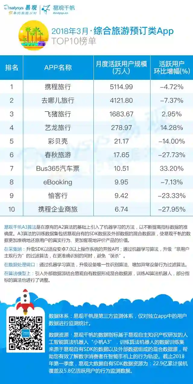 在2018年3月综合旅游预订行业APP排行榜中,携程继续保持优势,以5114.99万的活跃用户位列第一。去哪儿旅行、飞猪旅行和艺龙旅行分别位列二、三,四位。其中,仅飞猪旅行和艺龙旅行环比增长,增幅分别为2.95%,14.28%。