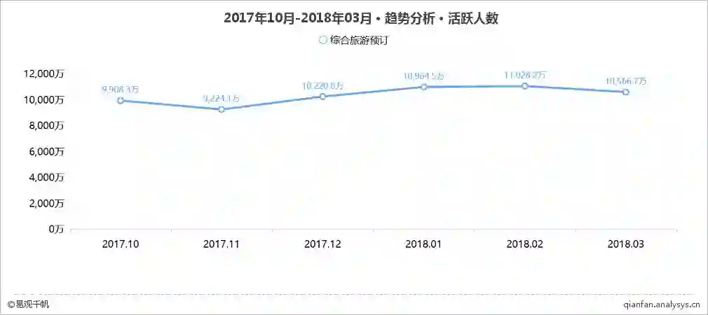 随着春运的结束,假期的减少,3月综合旅游预订市场开始回落,但清明假期的临近为3月的综合旅游预订市场又带来活力。整体来看,根据易观千帆数据显示,2018年3月综合旅游预订应用活跃用户规模为10566.7万,较2月稍稍减少。