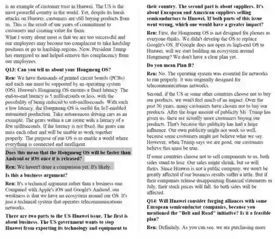 记者问:听说你们研发了新操作系统叫“鸿蒙”,您认为华为有能力部署这个操作系统,来替代谷歌的安卓系统吗?
