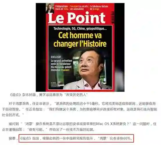 2019年6月18日,华为公司创始人任正非先生接受了法国《观点》周刊的专访。而近期有大量的报道指出,任正非就是在这次专访中“亲口宣布鸿蒙比安卓快60%”的言论。为了探寻此消息来源的真实性,我们在华为官方找到了此次专访的纪要原文,如下: