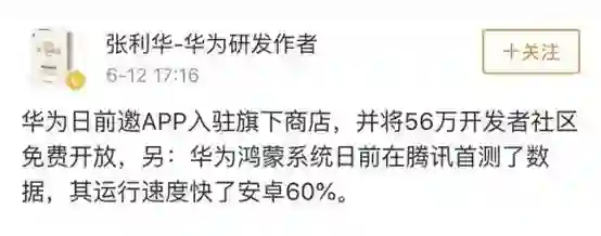 按照存在一份“技术论据”和“中国研究报告”这个线索,笔者继续搜寻。“比安卓快60%”大概所指的是6月中旬一位“华为研发者”的爆料。据称“腾讯测试数据表明鸿蒙比安卓快60%”。不过也仅仅是一张“传言”的截图,并无实际详尽测试报告发布。
