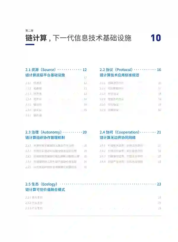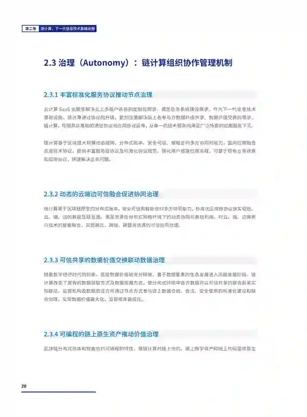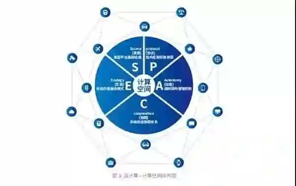 链计算:以“计算空间”(Computing Space)为资源池的计算单元,该计算单元具备 Source(资源)、Protocol(协议)、Autonomy(治理)、Cooperation(协同)、Ecology(生态)五种可弹性扩展能力,并通过标准化协议族,实现链计算数据、应用系统、组织机构的治理,进而推动技术、应用、事务、产业的协同。通过区块链分布式动态组网能力,数据共享能力、业务协同能力,由技术服务向业务服务转型,构建出云、端、边、链的无边界协同的价值网络。