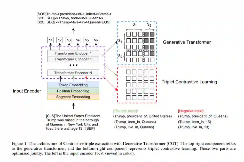 在自然语言处理和知识图构造的信息提取中,三次提取是必不可少的任务。在本文中,我们将重新审视用于序列生成的端到端三重提取任务。由于生成三元组提取可能难以捕获长期依赖关系并生成不忠实的三元组,因此我们引入了一种新颖的模型,即使用生成Transformer的对比三元组提取。具体来说,我们介绍了一个共享的Transformer模块,用于基于编码器-解码器的生成。为了产生忠实的结果,我们提出了一种新颖的三重态对比训练对象。此外,我们引入了两种机制来进一步提高模型性能(即,批量动态注意遮罩和三级校准)。在三个数据集(即NYT,WebNLG和MIE)上的实验结果表明,我们的方法比基线具有更好的性能。