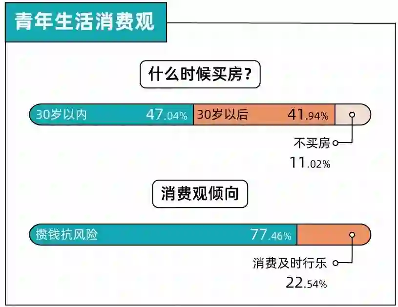 消费观方面,近5成人想在30岁之前买好房子,另外4成人希望在30岁以后。由于反复无常的疫情肆虐,7成年轻人倾向于攒钱抗风险,仅3成人支持及时行乐。