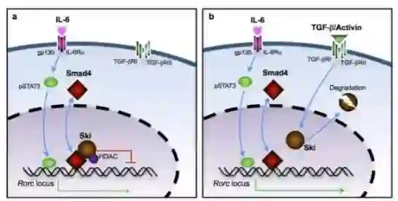 辅助性T细胞17(TH17)在宿主防御、炎症反应、以及自身免疫等环节起到了重要的作用。在TH17细胞的分化中,TGFβ有着极为关键的作用,但具体的调控细节仍不清楚。在这项研究中,同样是来自北卡罗莱纳大学教堂山分校的Yisong Wan博士课题组揭示了背后的奥秘。原来,体内由SKI-SMAD4介导的信号通路能抑制关键的RORγt受体表达,而TGFβ能够“逆转”这种抑制。与这个结果相一致,在缺乏SMAD4的T细胞中,即便没有TGFβ的作用,它也能分化成TH17细胞。这项结果揭露了TGFβ控制TH17细胞分化中的关键机制,也表明SKI-SMAD4有望成为潜在的成药靶点,用于治疗和TH17相关的疾病。