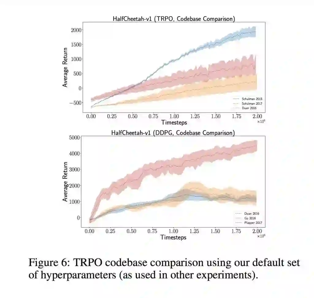在2017年,一些研究人员对学术论文结果的可重复性提出了担忧。深度学习模型通常需要大量的超参数,必须对其进行优化才能获得足够好的结果。这种优化通常非常昂贵,昂贵到只有像Google和Facebook这样的公司才能负担得起。研究人员并不总是发布他们的代码,并且出于各种原因忘记把重要的细节放到完成的论文中,这使得可重复性成为一个很大的问题。在Reinforcement Learning That Matters这篇文章中,研究人员表明,使用相同的算法和不同的基础代码使得结果出现了很大的不同和很高的方差:
