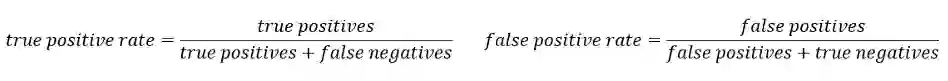 在阈值为 1.0 的情况下,我们将位于图的左下方,因为没有将任何数据点识别为正例,这导致没有真正例,也没有假正例(TPR = FPR = 0)。当降低阈值时,我们将更多的数据点识别为正例,导致更多的真正例,但也有更多的假正例 ( TPR 和 FPR 增加)。最终,在阈值 0.0 处,我们将所有数据点识别为正,并发现位于 ROC 曲线的右上角 ( TPR = FPR = 1.0 )。