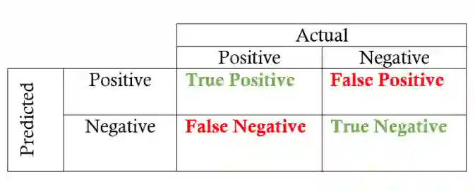 首先要介绍一下混淆矩阵(confusion matrix),给定一个模型的预测标签时,它可以被用来快速计算精度和召回率。二分类的混淆矩阵总共包含四个不同的结果:真正例(TP)、假正例(FP)、真反例(TN),以及假反例(FN)。列表示真实值,行表示预测值。行和列的交叉点指的就是这四种结果。例如,如果我们将一个数据点预测为正例,但是它实际上是反例,那么这就是一个假正例。