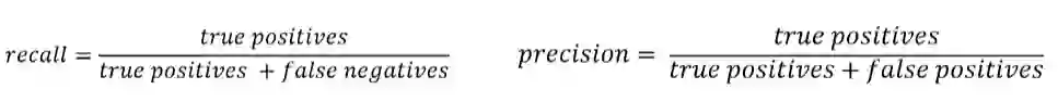直观地说,我们知道在恐怖分子检测的问题中宣布所有的数据点为负例(非恐怖分子)是毫无裨益的,相反,我们应该聚焦于正例(恐怖分子)的识别。直觉告诉我们,我们应该最大化的是统计学上称为召回率或查全率(recall)的衡量指标,或者是最大化模型找到数据集中所有相关案例的能力。召回率的准确定义是:真正例除以(真正例+假反例)的和,如下图所示。真正例(true positives)是被真确分类的正例数据点,假反例(false negatives)是被错误分类的负例数据点。在恐怖分子检测的例子中,TP 是被正确识别的恐怖分子,FN 是模型误分类为非恐怖分子的恐怖分子的数据点。召回率可以被理解为模型找到数据集中所有感兴趣的数据点的能力。