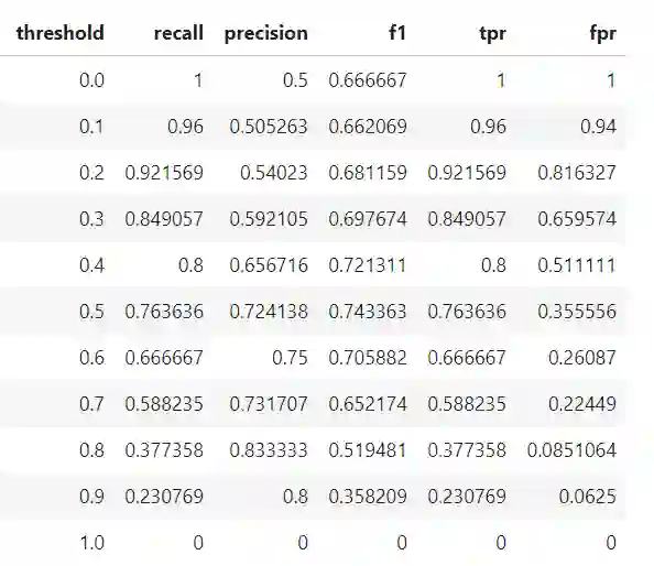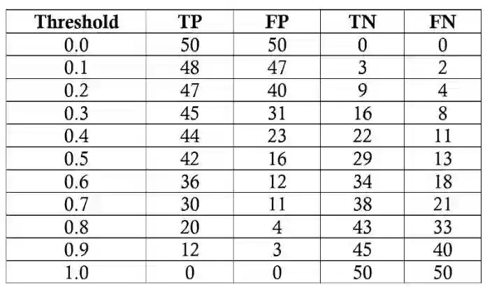 我们的任务是为 100 名病人诊断一种在普通人群中患病率是 50% 的疾病。我们将假设一个黑盒模型,我们输入关于患者的信息,并得到 0 到 1 之间的分数。我们可以改变将患者标记为正例 (有疾病) 的阈值,以最大化分类器性能。我们将以 0.1 为增量从 0.0 到 1.0 评估阈值,在每个步骤中计算 ROC 曲线上的精度、召回率、F1 score 以及在 ROC 曲线上的位置。以下是每个阈值的分类结果: