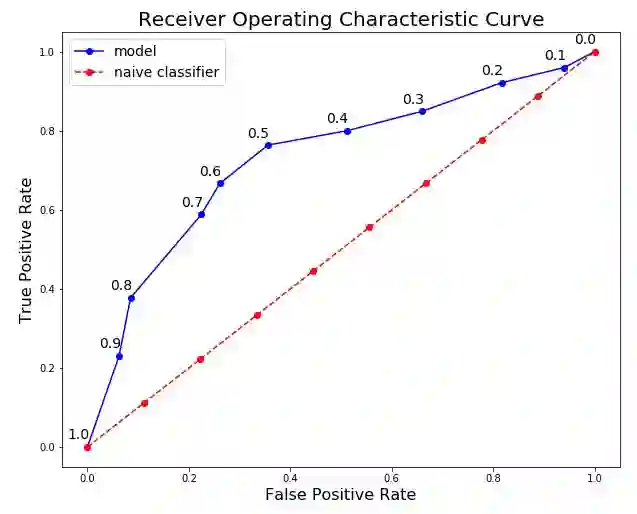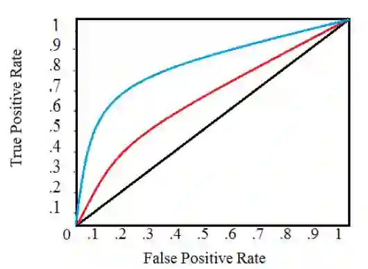 黑色对角线表示随机分类器,红色和蓝色曲线表示两种不同的分类模型。对于给定的模型,只能对应一条曲线。但是我们可以通过调整对正例进行分类的阈值来沿着曲线移动。通常,当降低阈值时,会沿着曲线向右和向上移动。