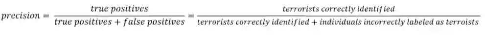 精度被定义为真正例除以(真正例+假正例)的和,如下图所示。假正例(FP)指的是模型将实际上是反例的样本误判为正例的情况,或者说,在我们的例子中指的是那些被模型判断为恐怖分子,而实际上不是恐怖分子的个体。召回率(查全率)表达的是模型找到数据集中相关实例的能力,而精度(查准率)表达模型找到的数据点中实际相关的比例。
