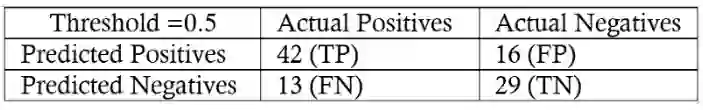 我们将以阈值为 0.5 为例计算对应的召回率、精度、真正例率、假正例率。首先我们得到混淆矩阵: