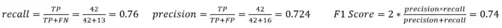 我们可以利用混淆矩阵中的数值来计算召回率、精度和 F1 score: