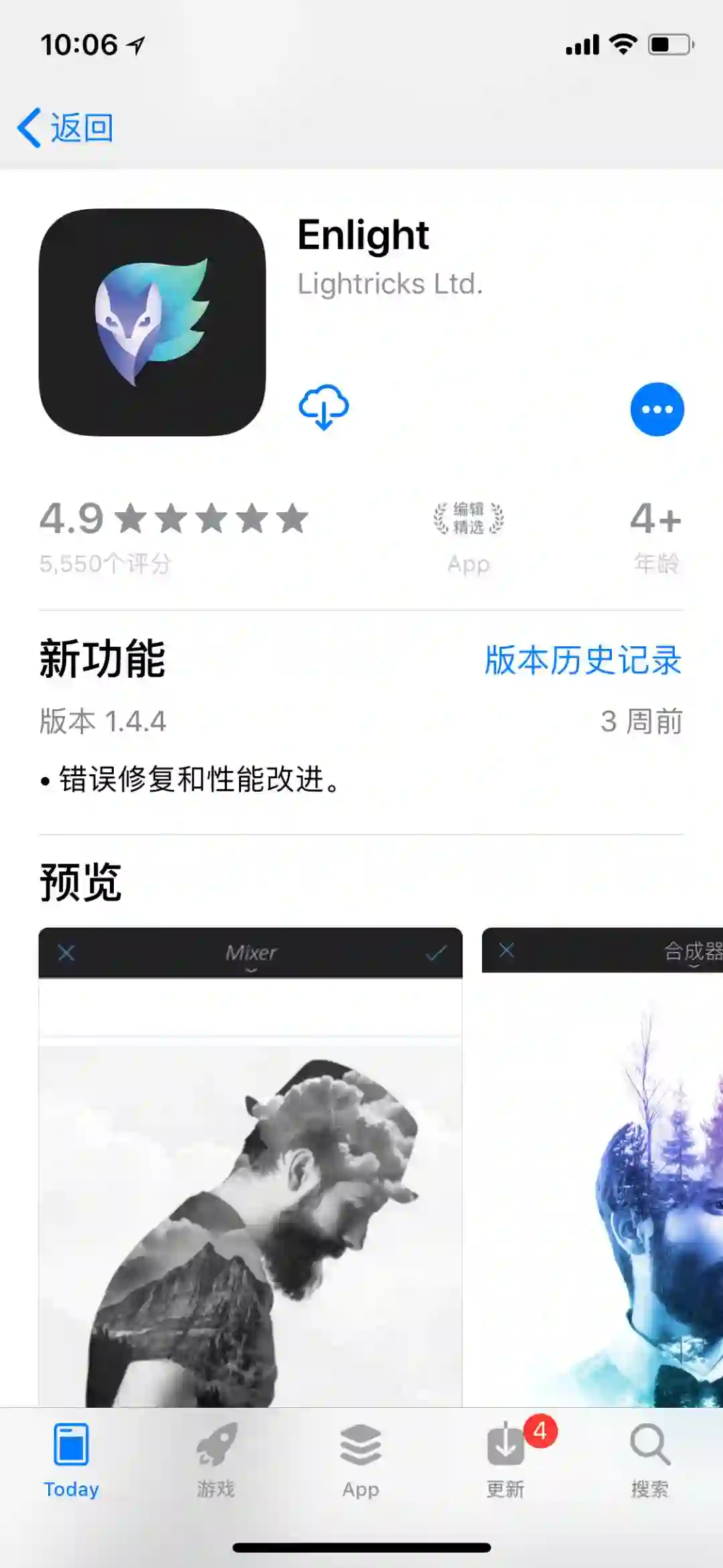 下载注意:该软件无内购,但会提示升级第二代 Enlight Photofox,后者采用内购,所以当遇到升级提示直接忽略即可。