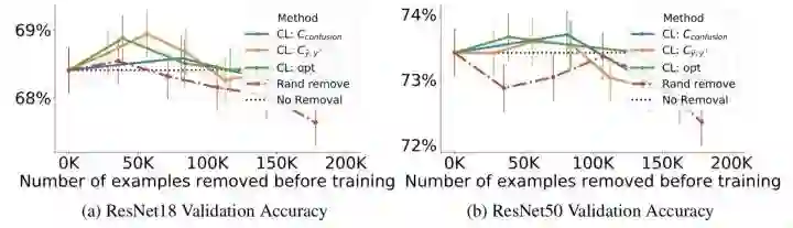 图10给出了分别去除20%,40%…,100%估计错误标注的样本后训练的准确性,最多移除200K个样本。可以看出,当移除小于100K个训练样本时,置信学习框架使得准确率明显提升,并优于随机去除。