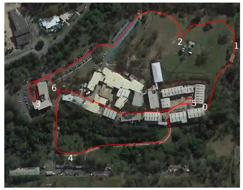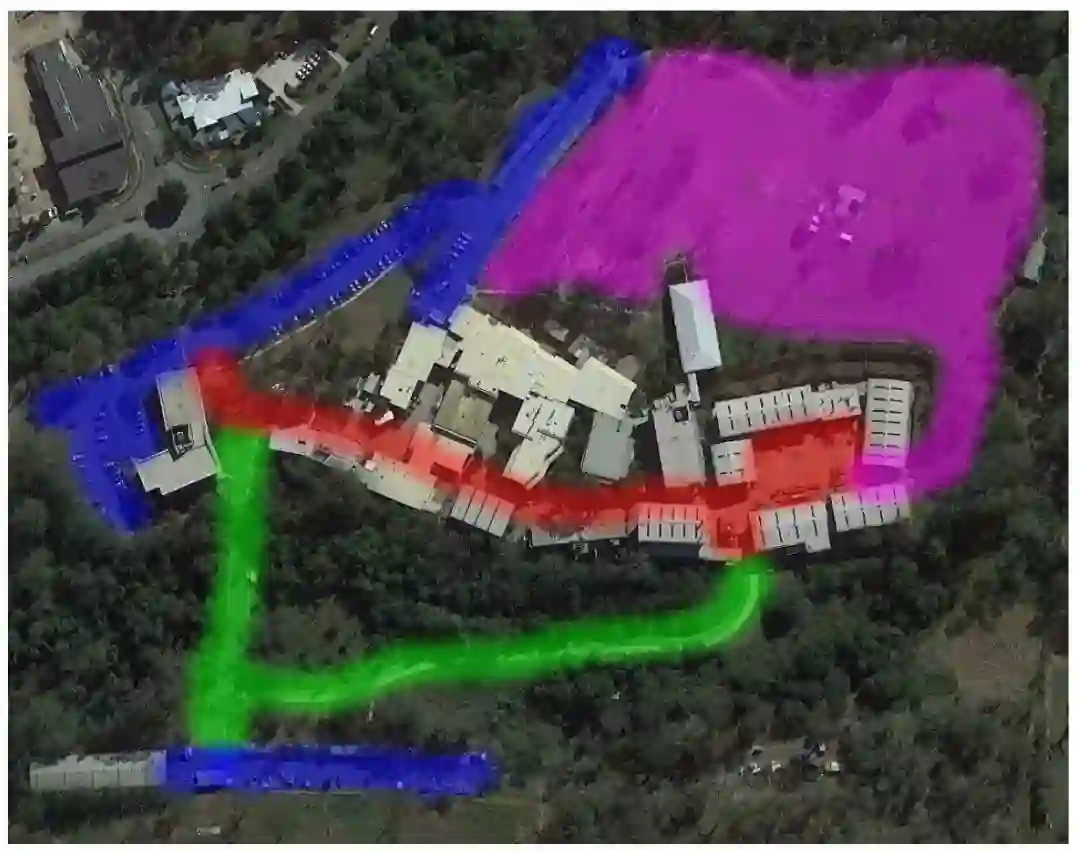 图1 测试地点为Queensland Centre of Advanced Technologies (QCAT),测试场地在图中使用颜色进行标注。红色:建筑物;蓝色:停车场;绿色:密集的树林和灌木;紫色:具有开阔草地以及稀少数目的越野坡地。