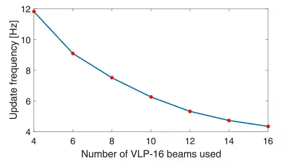 图4 在同一数据集上使用不同的激光线数进行计算的平均更新率。计算平台使用安装了Intel Core i7-4910MQ处理器的 Dell Precision M4800。
