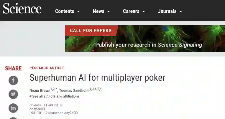 Brown, N. and Sandholm, T. 2019. Superhuman AI for multiplayer poker. (https://science.sciencemag.org/content/early/2019/07/10/science.aay2400) Science, July 11th.
