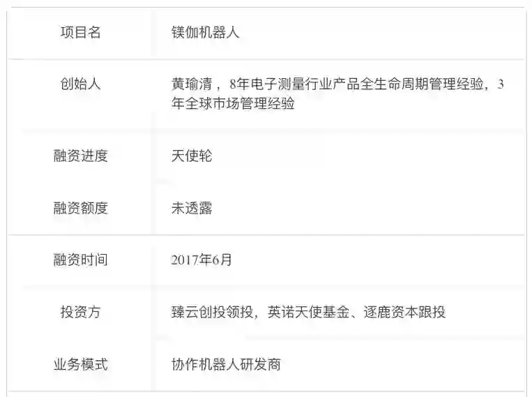 近日,“镁伽机器人”创始人黄瑜清向铅笔道记者透露,公司已于今年6月完成了天使轮融资,投资方为臻云创投、英诺天使基金、逐鹿资本。