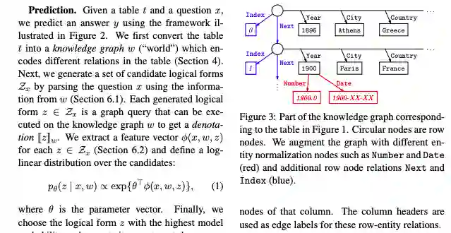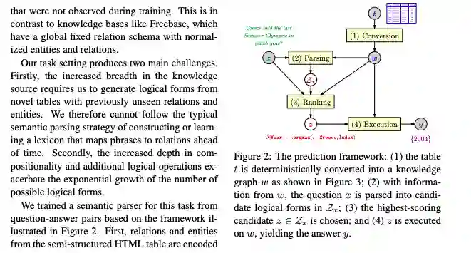 创新点:本文训练了一个语义分析器,首先将关系和实体从半结构化HTML表中编码。然后,系统分析问题成为覆盖率高的候选逻辑形式语法,用对数线性重新排列候选项模型,然后执行得分最高的逻辑形式来产生答案的表示