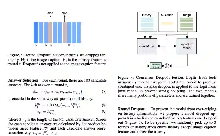 视觉对话任务需要一个模型来利用图像和对话以生成针对当前对话的下一个响应。然而存在大量对话问题是不需要通过任何上下文历史信息就可以根据查询图像而得以解答。这篇论文认为以往的联合模式(历史加图像信息)模型过于依赖且更易记住对话历史,而仅图像模型更加具有通用性,并且在允许多个正确答案时表现更好。因此这篇论文鼓励维护两个模型,即仅图像模型和图像-历史联合模型,并将它们的互补能力结合起来以形成更平衡的多峰模型。这篇论文通过集成和共有参数的共识落差融合,提出了两种方法用于这两个模型的集成,并且在2019年视觉对话挑战赛上取得了出色的成绩。