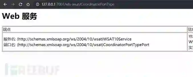 2.可通过访问路径/wls-wsat/CoordinatorPortType,判断wls-wsat组件是否存在。若返回如下页面,则此组件存在。请引起关注,及时采取防护措施。