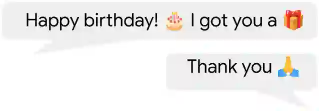 请注意,所提出的两种方法(使用 Twitter 标签和使用表情符号)都不是直接针对情绪理解,而是针对对话表达的各种变体。例如,在下面的对话中,🙏 表示感谢,🎂 表示庆祝,以及 🎁 代替了文字“礼物”。同样,虽然许多表情符号与情绪表达有关,但情绪是微妙和多面的,在许多情况下,没有一个表情符号能够真正捕捉到某种情绪的全部意义。此外,表情符号可以捕捉到情绪以外的不同表达方式。综上所述,我们认为表情符号是表达方式而不是情绪。