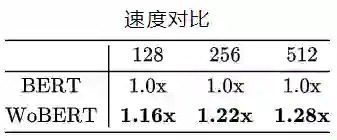 我们内部还测了不少任务,结果都是类似的,表明这些NLU任务上WoBERT和BERT基本上都差不多的。但是速度上,WoBERT就比BERT有明显优势了,下表是两个模型在处理不同字数的文本时的速度比较: