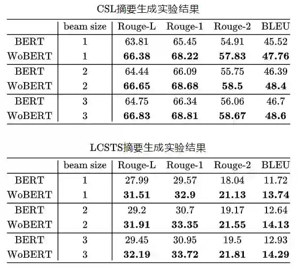 我们还测了WoBERT+UniLM的方式Seq2Seq任务(CSL/LCSTS标题生成),结果是比以字为单位的模型有明显提升: