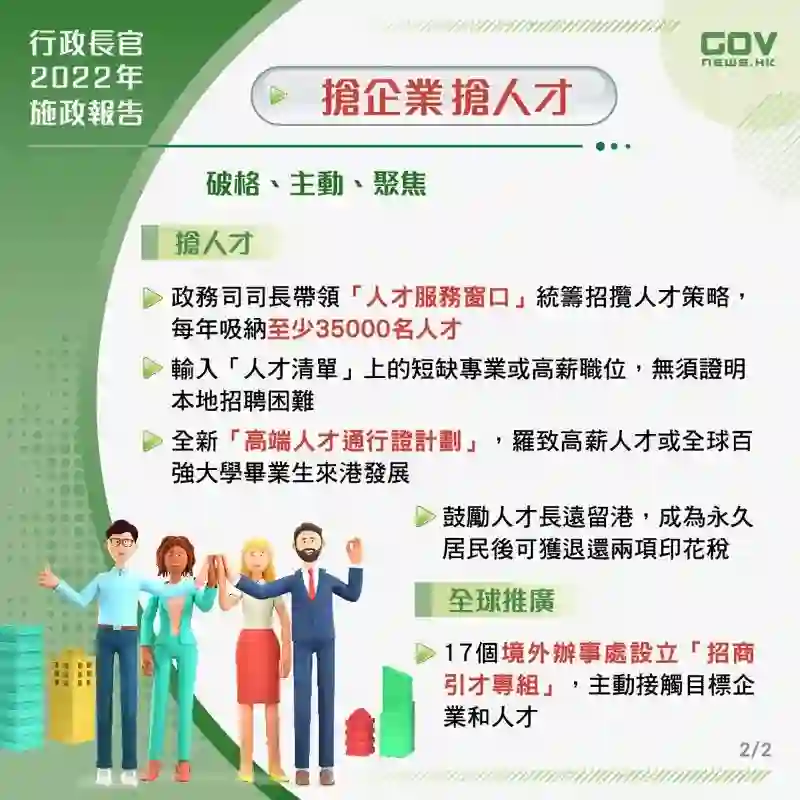 其他,还有放宽“非本地毕业生留港、回港就业安排”,优化“科技人才入境计划”。