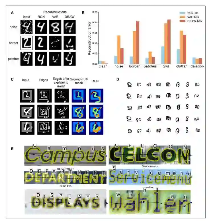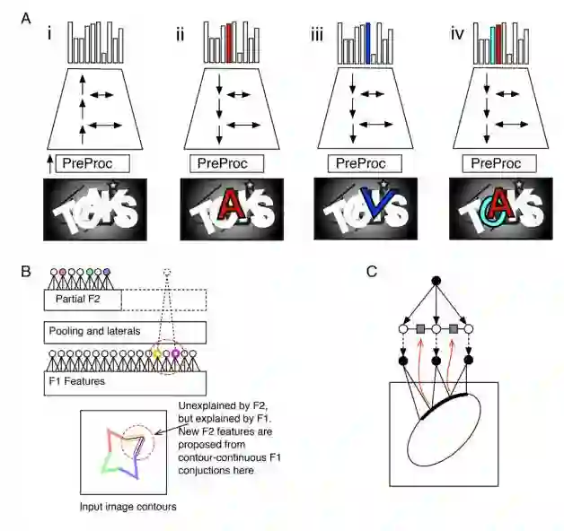 上图(A)中的 i 为前向传播(包括了侧面传播),生成多个字母的假设展示在输入图像中。PreProc 是一组类 Gabor 的滤波器,可以将像素转化为边缘似然度。ii 为后向传播和侧面传播(lateral propagation)创建的分割掩码,它可用来挑选前向传播的假设,上图掩码为「A」。iii 是错误的假设「V」正好拟合「A」和「K」的交叉点,错误的假设需要通过解析来解决。(iv)可以激活多个假设以产生联合解释来避免字母遮挡情况。(B)第二级特征上学习各种特征。彩色的圆圈表示特征激活,虚线圆圈表示提出的特征。(C)从轮廓领域学习边缘(laterals)。