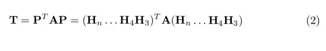 其中T是三对角矩阵,P是正交矩阵。为了执行这样的正交相似变换,我们可以将 P 分解为 n-2 个 Householder 反射器。这有重新表示:
