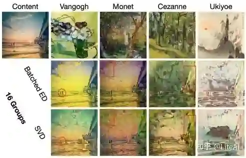 )。数值测试表明,对于维度小于 24 的矩阵,我们的 Pytorch 实现始终比任何批处理的默认 SVD routine快得多。对于较大尺寸的矩阵(例如,dim=32 或 36),当批量大小相应较大时,我们的方法也可能具有优势(见图 1)。我们验证了我们的方法在可微 SVD 的几个应用中的有效性,包括去相关 BN、视觉Transformer的协方差池化和神经风格迁移。我们的批处理 ED 实现了与 SVD 有竞争力的性能。