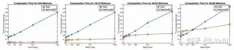 图 5 描述了我们的批处理 ED 针对不同矩阵尺寸和批量大小的 SVD 的计算时间。SVD 的时间成本几乎随着批量大小线性增长,而我们的批量 ED 的时间消耗对于不同的批量大小只有轻微的变化。对于维度小于 24 的矩阵,我们的批处理 ED 对于任何批量大小都始终比 SVD 快。当矩阵维度为 32 时,我们的方法比批量大小为 256 的 SVD 更快。