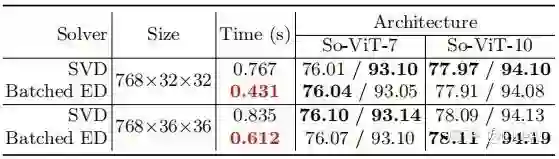 用于辅助分类任务。由于全局协方差矩阵通常是非常病态的 [38],这项任务对 ED 算法的稳定性提出了巨大挑战。我们选择了不同深度的 So-ViT 架构,并在 ImageNet [14] 上验证了性能。从表 3 中可以看出,我们的批处理 ED 具有与标准 SVD 有竞争力的性能。此外,对于不同大小的协方差,我们的方法比 SVD 快 44% 和 27%。