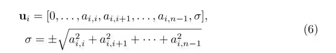 可以看出,等式 (4) 实际上在 A 上定义了一个对称的 rank-2 更新。通过对等式(4)的一些推论,每个 Householder 反射器可以设计为在一行和一列中引入零entries(见图 2)。为简洁起见,我们省略了向量的推导,并在此处给出结果: